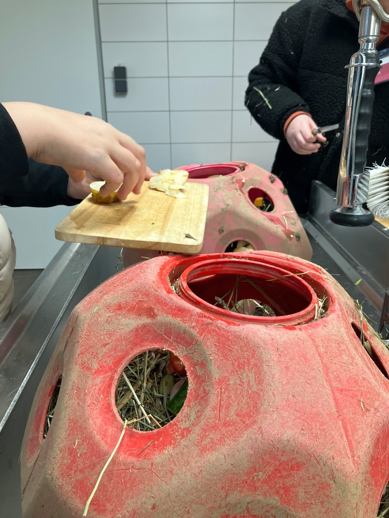Gemeinsam haben die Kinder beim Ausmisten, Futter schnippeln, FutterbĂ€lle fĂŒllen und HeusĂ€cke verteilen geholfen – und waren voller Freude, dass sie direkt mithelfen durften.
