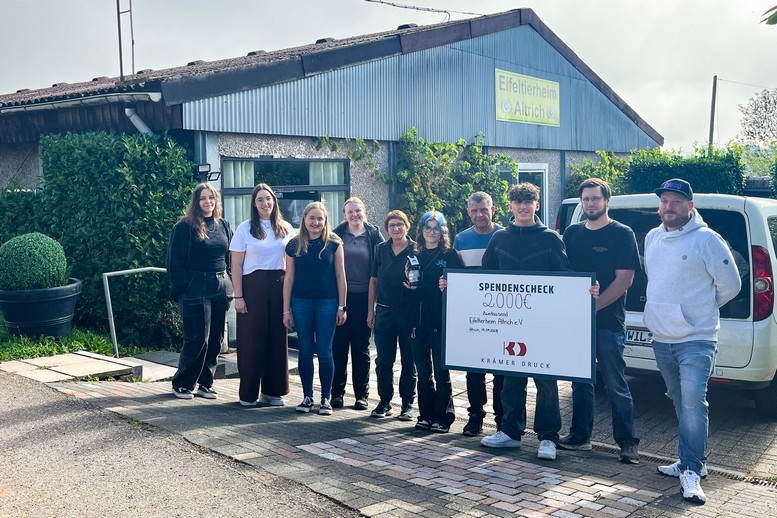 Die Auszubildenden der Firma Krämer Druck überreichten am vergangenen Freitag eine Spende in Höhe von 2.000 € an das Eifeltierheim. Möglich wurde dies durch ein besonderes Azubi-Projekt sowie zahlreiche Spenden aus der Belegschaft. Geschäftsleitung, Mitarbeitende und Auszubildende zogen dabei an einem Strang: Während die Azubis ein eigenes Sektetikett entwarfen und realisierten, unterstützten die Kolleginnen und Kollegen das Projekt mit dem Kauf der Flaschen und zusätzlichen Spenden – gemeinsam für den Tierschutz.