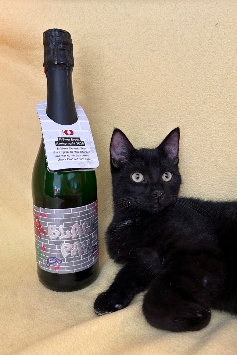 Das Etikett trägt den Namen „Black Paw“ – schwarze Pfote – eine Anspielung auf schwarze Tiere, die oft schwerer zu vermitteln sind und länger im Tierheim bleiben. Gleichzeitig würdigt der Name die „schwarzen Künstler“, also die Gesellinnen und Gesellen des Druckerhandwerks und verwandter Berufe wie die Mediengestaltung, die auch unsere Azubis bald erlernen werden.