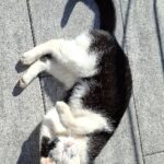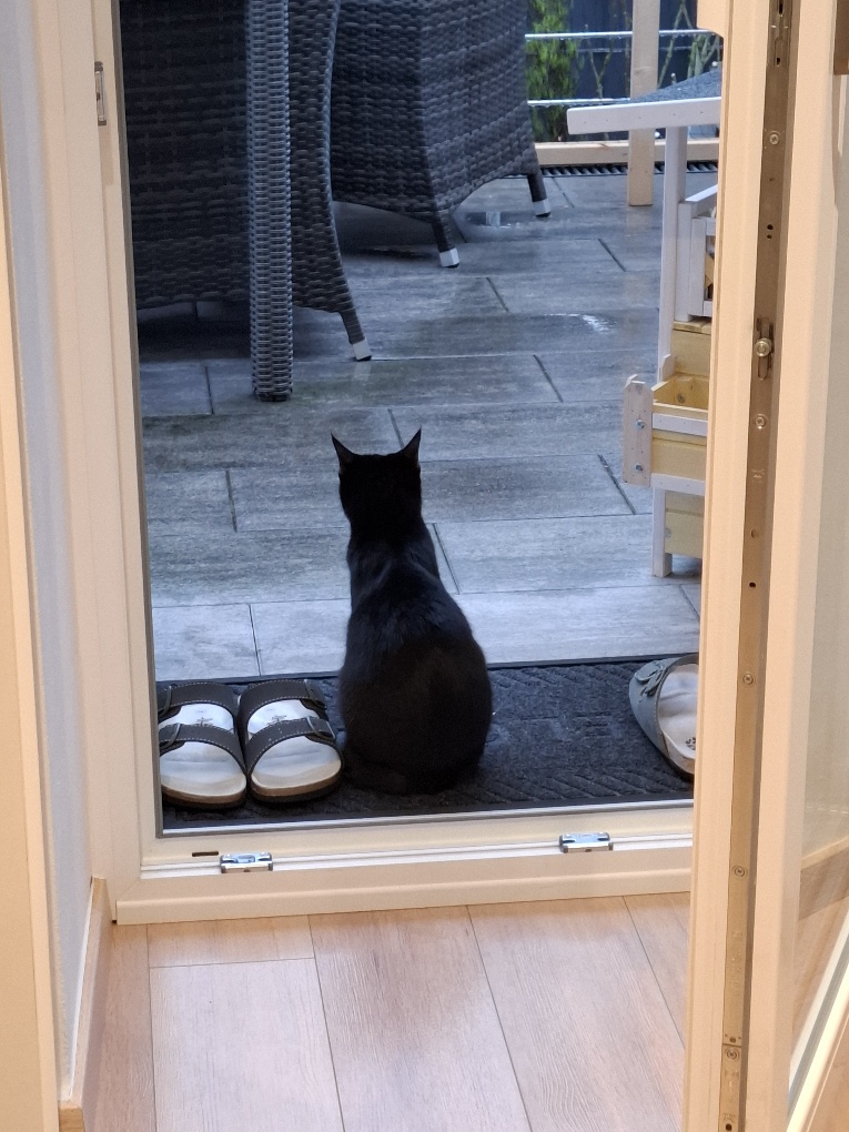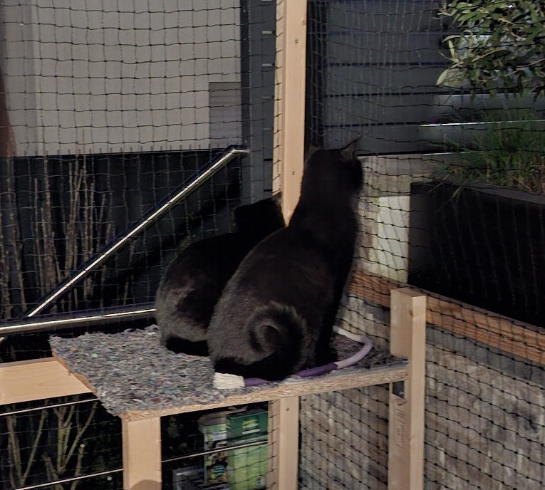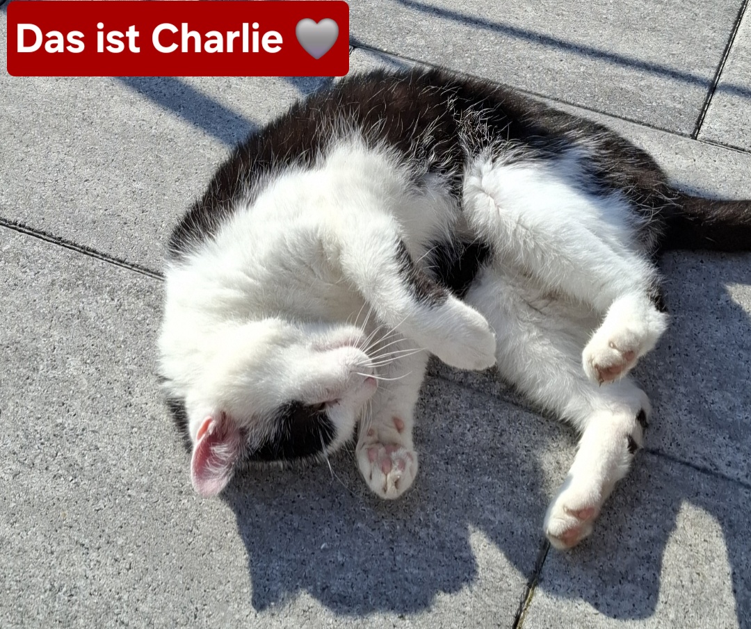 Die kenne ich jetzt auch schon alle, die kommen jeden Tag ans Netz zum Schnuppern. Besonders Charlie der Streuner hat es mir angetan. Er kommt auch immer hier her zum Fressen, nur die Dosenöffnerin darf ihn füttern und manchmal kurz streicheln (er ist sehr scheu und läuft sonst vor allen direkt weg). Der ist schon 15 Jahre, aber ich bin trotzdem ein bisschen verliebt in ihn. Wenn er kommt, räkel ich mich immer vor ihm auf dem Boden. Und gestern haben wir uns zum ersten Mal geküsst 🩶