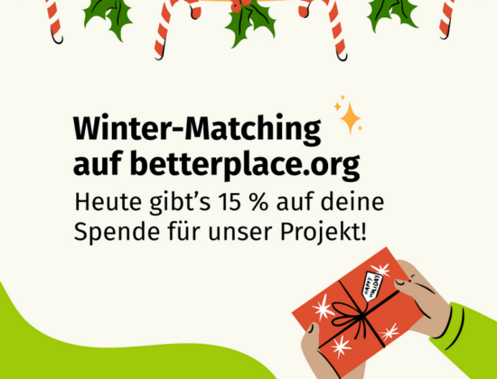 Alle Spenden bis einschließlich 100,- € werden mit 15 % verstärkt. Bei Spenden über 100,- € werden pauschal 15,- € gematcht. Insgesamt stehen für diese Matchingaktion an jedem Sonntag im Dezember 8.000,- € Aktionsbudget zur Verfügung. Der Matchingbetrag wird 14 Tage nach Ende der Aktion an unser Projekt ausgeschüttet.