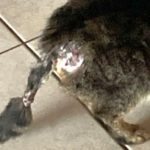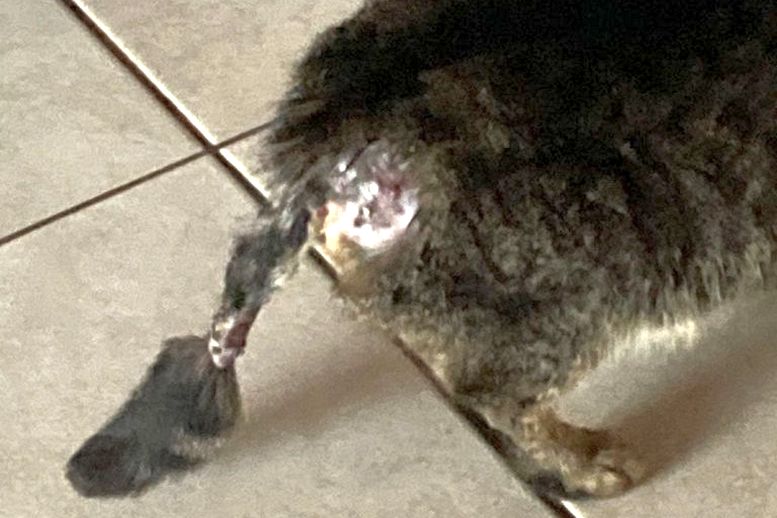 Leider ist Betty ängstlich, deshalb warten wir bis der Tierarzt auch Zeit hat, Betty zeitgleich mit der Eingangsuntersuchung auch in Narkose zu legen Die Wunde muss richtig versorgt werden und es könnte auch sein, dass der Schwanz amputiert werden muss.