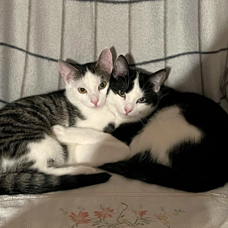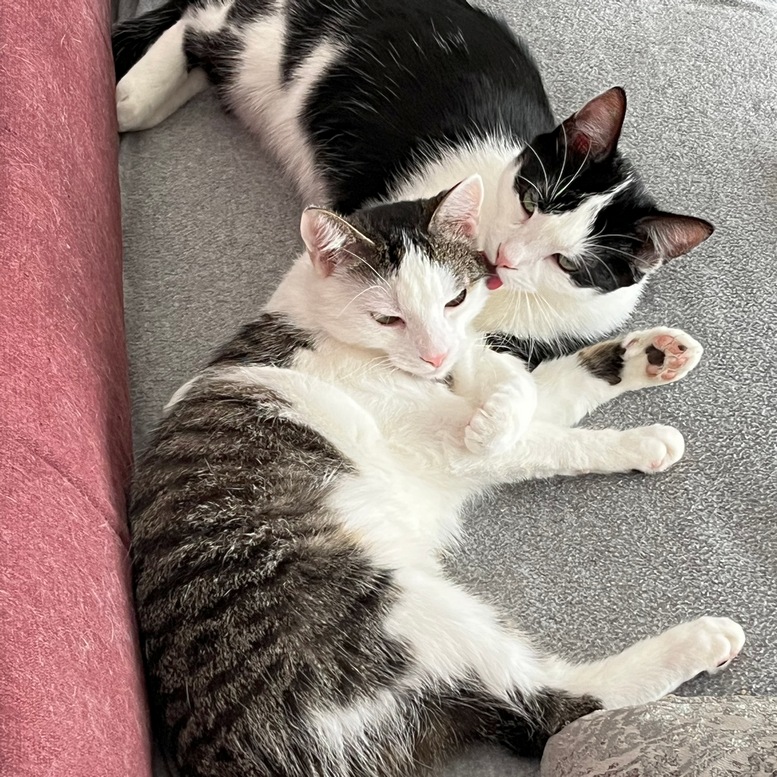 Sie hängen beide sehr aneinander, schmusen, spielen und raufen miteinander. Es ist eine wahre Freude. Seit einer Woche haben sie Freigang. Ich wollte erst sicher gehen, dass beide wirklich hier angekommen sind und auch wieder ins Haus kommen.