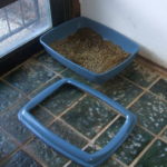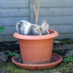 Hier ein paar Bilder. Praline liebt es, im Garten in die Blumentöpfe zu springen und zu schauen, ob es da was Essbares gibt – sie sind ja ständig am Rand des Hungertodes, obwohl sie pro Tag vier Möhren, zwei Stücke Gurke, diverses andere Gemüse und vier bis fünf Handvoll Heu vernichten 🙂 Da sie zwei Zimmer zum Auslauf haben und diesen auch nutzen, setzt das kein bisschen an, und dementsprechend haben sie natürlich auch einen gesegneten Appetit. Das Bild mit dem Kaninchenklo ist der Anblick, der sich mir am Sonntagmorgen bot – als ich die Treppe vom Schlafzimmer hinunterkam, sah ich, dass die beiden wohl beschlossen hatten zu helfen – sie hatten den Rand des Klos irgendwie abgenommen und daneben gelegt, genau wie ich es immer mache. Dass Kaninchen in freier Wohnungshaltung gerne menschliches Verhalten imitieren, kenne ich ja schon, aber es ist immer wieder lustig und interessant!