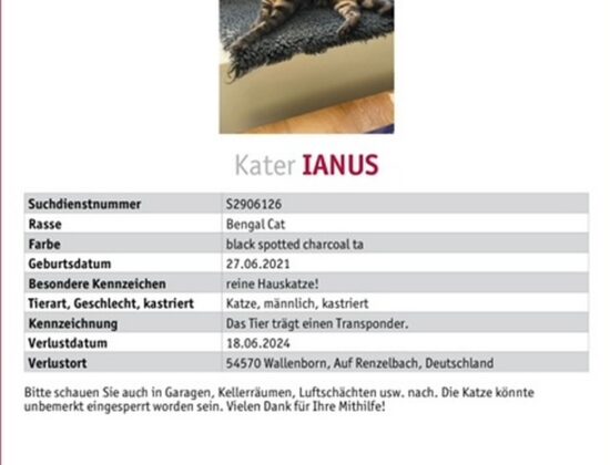 seit letzter Woche Dienstag ist unser Kater Ianus entlaufen.
