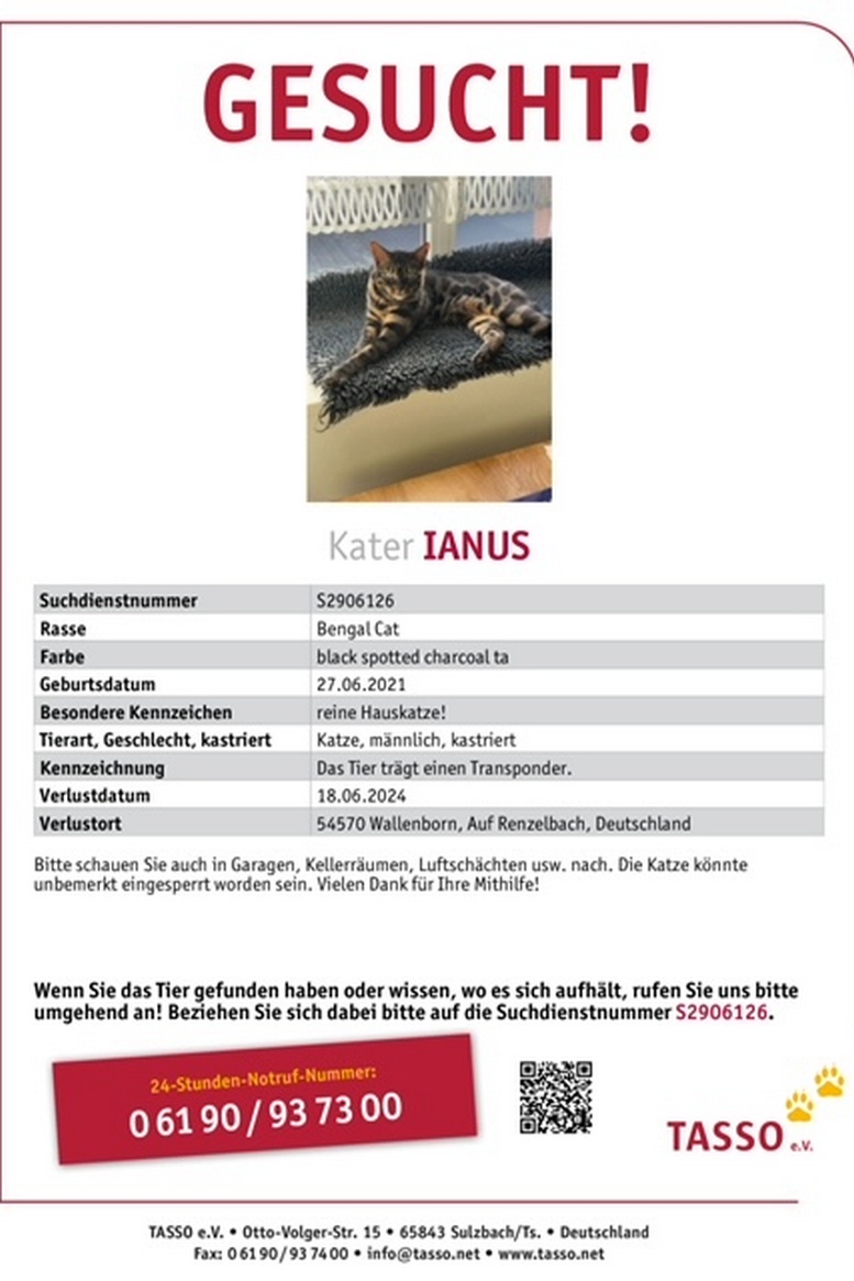 Die Meldung bei TASSO ist bereits seit Donnerstag veröffentlicht.