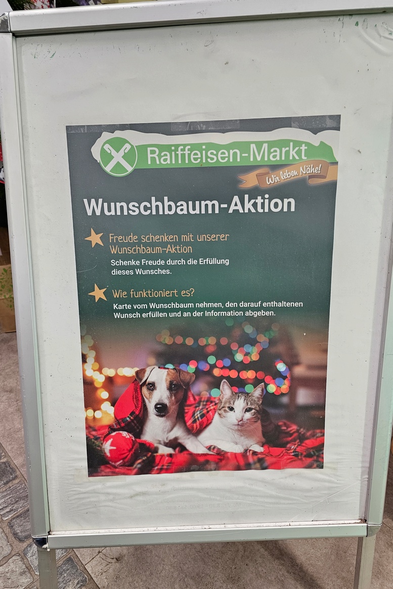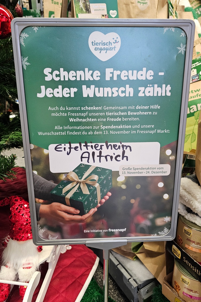 Wie auch in den letzten Jahren zuvor, haben wir im Das Futterhaus, Fressnapf und Raiffeisenmarkt in Wittlich wieder unsere Weihnachtsbäume stehen. An den Bäumen hängen die Wunschzettel unserer tierischen Bewohner, welche ihr gerne erfüllen dürft.