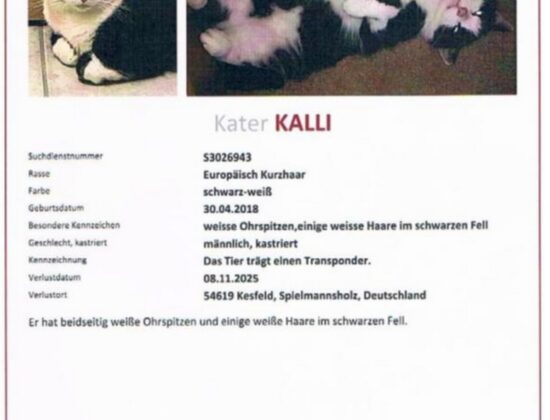 Kater Luni wird seit dem 14.10. in Bad Bertrich vermisst. Er ist in der Kurfürstenstraße am Wasserfall aus ihrer Transportkiste ausgebrochen. Da er sich Anfang des Jahres am Schwanz verletzt hatte, hat er nun eine Delle in der Mitte seines Schwanzes, woran man ihn erkennen kann. Zudem ist er gechipt und bei FINDEFIX registriert. Meldungen bitte an uns oder FINDEFIX.