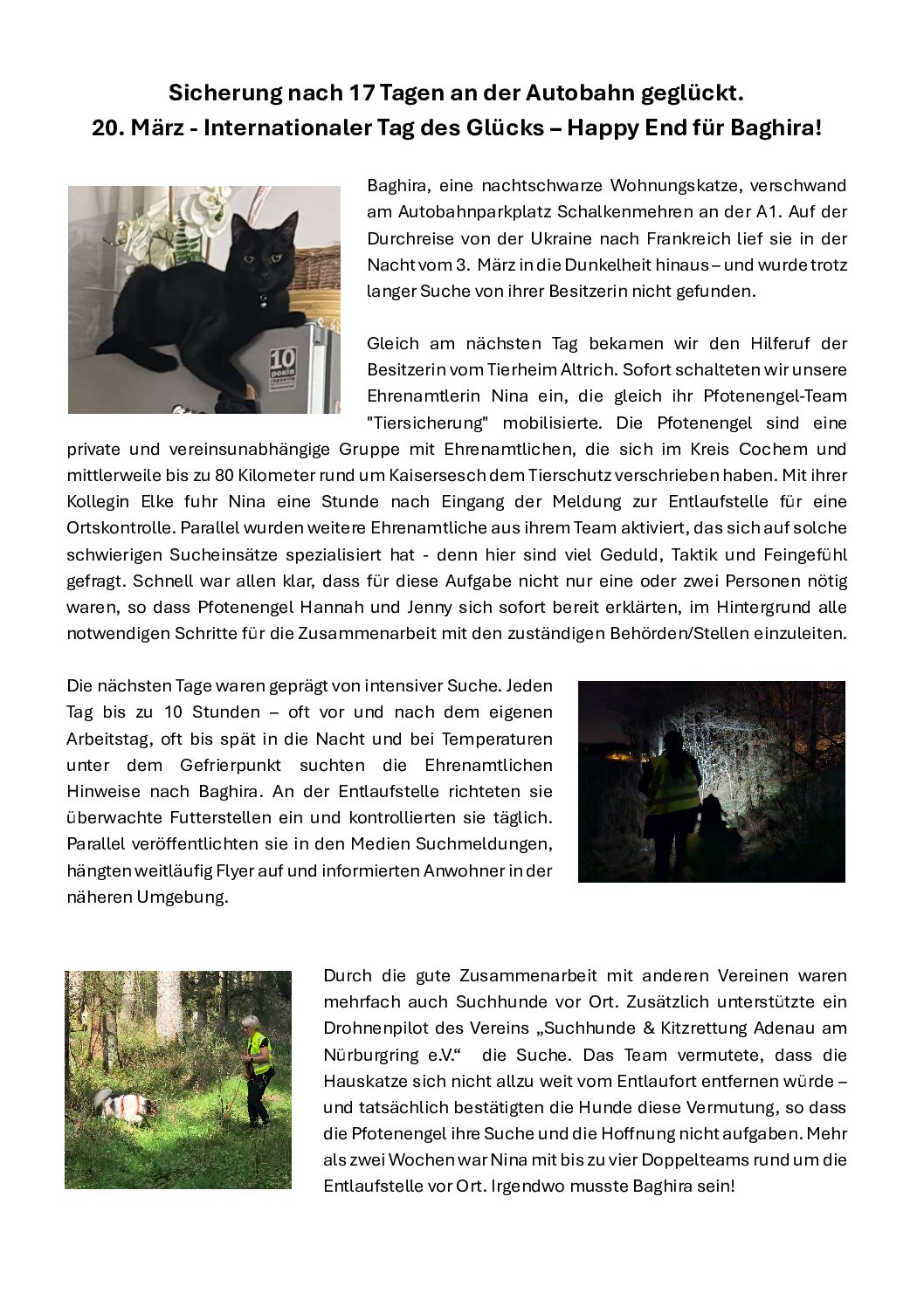 Wie bereits letzte Woche Freitag erwähnt, konnte die vermisste Katze Baghira eingefangen werden. Jetzt ist auch der Pressetext zu dieser Aktion freigegeben, falls Sie Interesse haben diesen zu lesen: