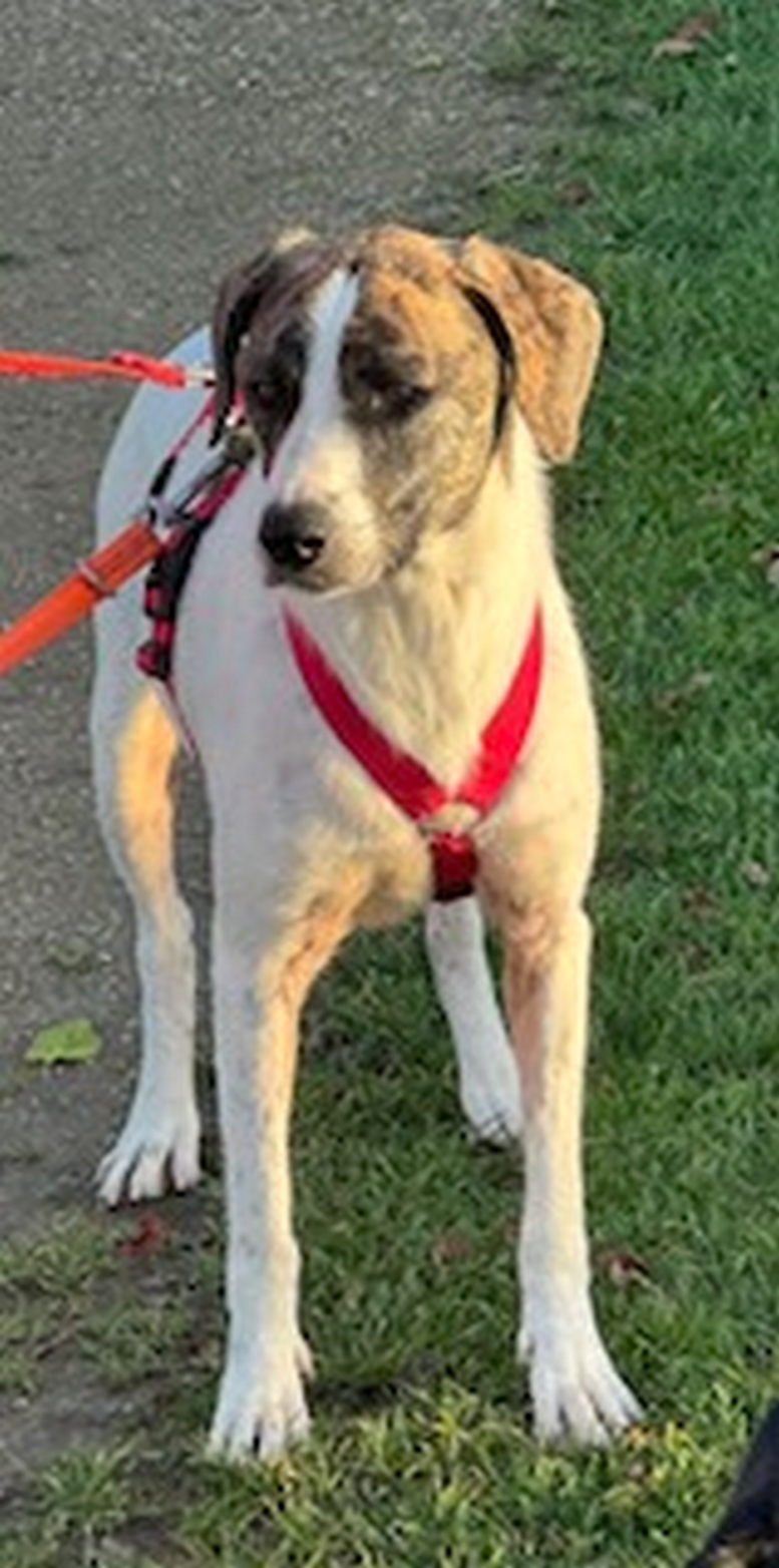 Chestnut ist eine junge Hündin, die in kurzer Zeit enorme Fortschritte gemacht hat. Anfangs etwas schüchtern, öffnet sie sich Menschen gegenüber immer mehr. Begegnungen auf Spaziergängen meistert sie inzwischen gut – bei ruhigen Hunden bleibt sie höflich stehen, schnuppert sogar und lässt sich beschnuppern.